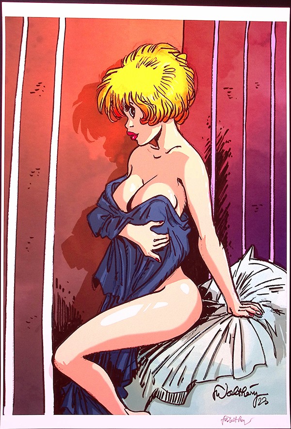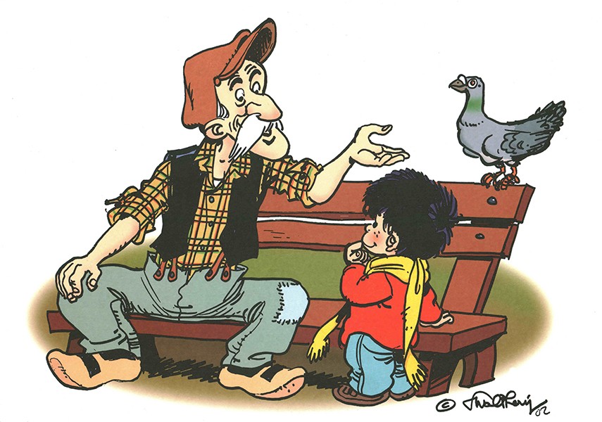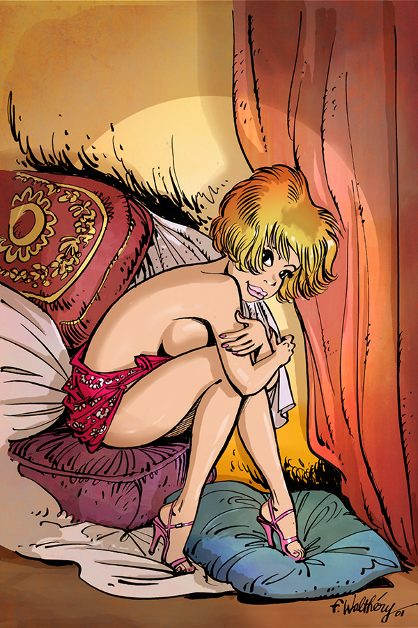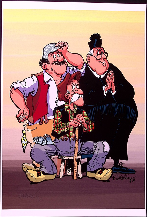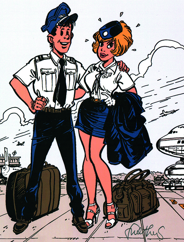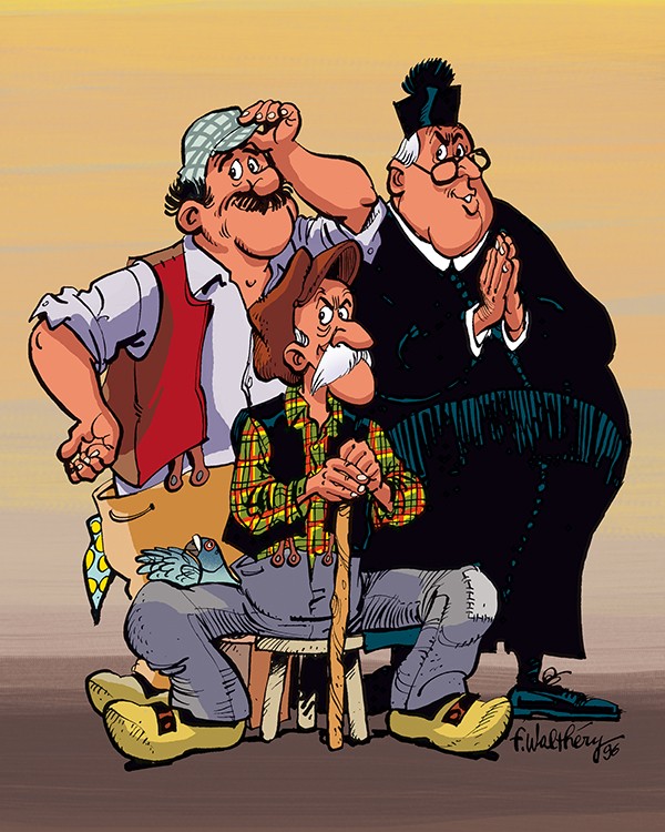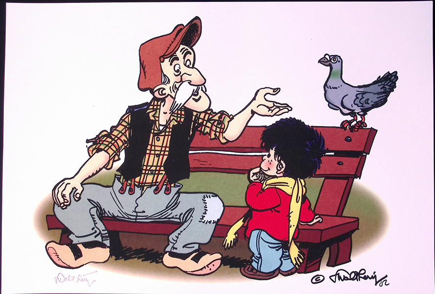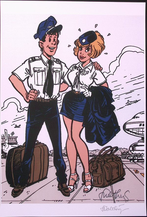 Né à Argenteau le 17 janvier 1946, François Walthéry est aiguillé à seize ans vers certains ateliers pratiques de Saint-Luc à Liège où on a senti que l’adolescent était doué pour le dessin, tout en n’ayant pas encore la maturité pour suivre les cours généraux destinés à des étudiants de loin ses aînés. Un voisin de Cheratte, le dessinateur Mittéï, lui donne quelques conseils de perfectionnement et les scénarios d’une vingtaine de gags de « Pipo » qui sont acceptés pour Junior, le petit frère de Tintin. En juillet 1963, encore en culottes courtes, il est conduit par sa mère à la rédaction de Spirou où le seul petit croquis qu’il a avec lui, dans son portefeuille, attire l’attention d’Yvan Delporte, de Charles Dupuis et de Peyo ! Désespérément à la recherche de collaborateurs pour répondre à la demande de planches des Schtroumpfs, Peyo le prend dans son studio, mais découvre rapidement que l’adolescent n’est pas très à l’aise avec les petits lutins bleus. Il lui faudrait une série plus dynamique. Supervisé au début par Will, Walthéry est dirigé vers la série « Jacky et Célestin », produite pour Le Soir illustré. De l’automne 1963 à 1966, Walthéry, sous le pseudonyme de Pop’s, en dessine quatre épisodes et développe graduellement son style. Lorsqu’il termine son service militaire, il est jugé apte à assurer la suite de « Benoît Brisefer », série plus ambitieuse que le Maître réserve à Spirou. Là aussi, il assumera quatre épisodes, de 1968 à 1973. Parallèlement, il met en route un nouveau personnage sur un scénario de son compagnon de Studio, Gos : « Natacha, hôtesse de l’air » est acceptée dès 1967, mais ce n’est qu’en 1970 que cette petite bonne femme déterminée débarque dans Spirou. Les rédacteurs devront désormais se relayer pour courir derrière un dessinateur aux retards proverbiaux. Ce sera pire encore lorsque, le succès aidant, l’éternel gamin honorera de sa présence tous les festivals de France et de Navarre. En trente années d’existence, la pulpeuse créature n’a pas encore atteint les vingt albums ! Les scénaristes (Gos, Borgers, Stoquart, Wasterlain, Tillieux, Mittéï, Cauvin, Mythic, Peyo, Michel Dusart) et les décorateurs (Jidéhem, Mittéï, Will, Wasterlain, Laudec, Georges Van Linthout) se succèdent pourtant à son chevet, mais ses épisodes ont été proposés à doses homéopathiques, d’abord par Dupuis (13 albums en 18 ans), puis par Marsu-Productions à partir de 1989 (une demi-douzaine de titres). Durant les absences de la belle, il arrive au dessinateur de se tourner vers de petits projets plus ou moins éphémères : un recueil des histoires pigeonnantes du « Vieux Bleu » sur scénarios de Cauvin en 1980, un hommage au personnage folklorique liégeois « Tchantchès » en 1988, des plaquettes publicitaires et des calendriers scouts. Après deux volumes chez Marsu-Productions de son personnage le plus autobiographiques, « Le P’tit Bout de chique », il l’a remis aux soins de Mittéï et il supervise la série « Rubine », dessinée par Dragan de Lazare et scénarisée par Mythic depuis 1993 pour les éditions du Lombard.